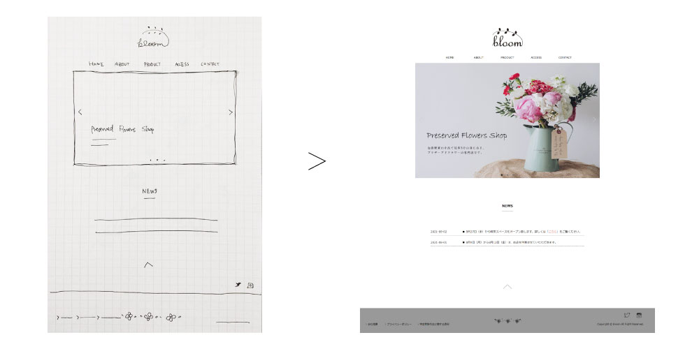 背景、文字は白黒ベースにして色味をなくし、花の美しさを強調しています。