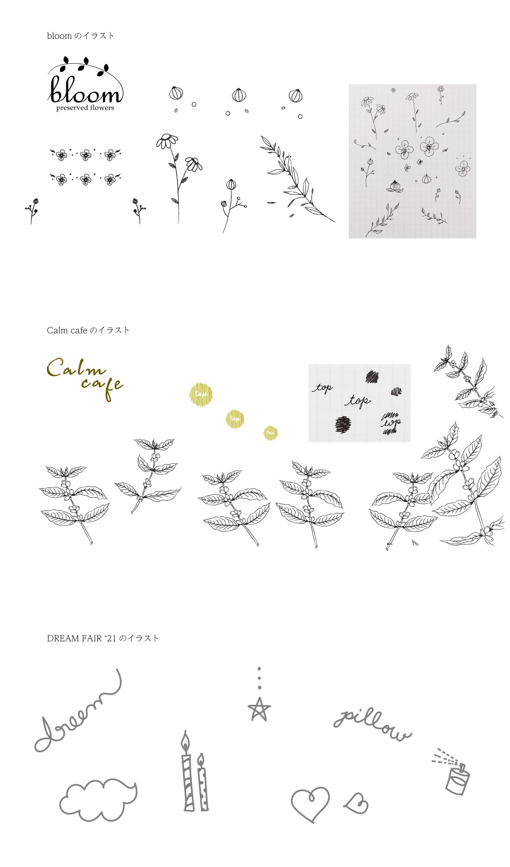 Illustration 各サイトに配置したオリジナルのイラストです。 デザインについて オリジナリティを出すためにIllustratorでイラストを描き出しました。色調はモノトーン、線は細目にして画像とのバランスを考慮しました。 Works一覧へ
